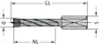 Ausführung: HW-massiv-Schneidkopf mit Zentrierspitze, zwei Schneiden und negativ angeschliffenen Vorschneidern. Vergrößerter Rückenfreischliff. Spiralteil kunststoffbeschichtet, mit Rückenführung. Zylinderschaft mit Spannfläche und Tiefeneinstellschraube. Die Rückenführung (Führungfase) bringt verbesserte Zentrierung beim Rückhub und ermöglicht stufenlose Senkerbefestigung am Bohrerhalm.