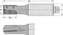 Ausführung: Tragkörper mit zwei wechselseitig schräg angeordneten HW-Wendeplatten, stirn- und umfangschneidend. Verschraubung an der Messerbrust. Mit HW-bestückter Einbohrschneide. Rechtslauf. Für mechanischen Vorschub.